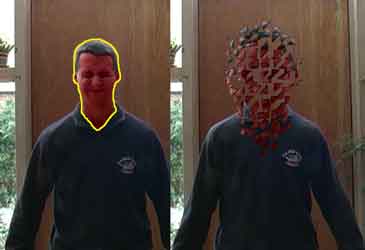 Für eine Explosion von Objekten gibt es natürlich mehrere Möglichkeiten. In Filmproduktionen werden oft in 3D-Programmen Modelle erstellt, die diese dann auch realistisch auseinanderfliegen lassen können. Diese Arbeit wollte ich mir hier nun nicht machen, denn mein Effektprogramm bietet die Möglichkeit, Bilder mit einem "zertrümmern"-Effekt zu belegen. Also nahm ich das letzte Bild vor der Explosion und legte eine Maske um den Kopf an, damit der Effekt auch nur auf den Kopf wirkte. Da der Kopf die meiste Zeit sowieso von Flammen überlagert sein würde, reichte der Effekt völlig aus. Fast die selbe Maske ist übrigens zum Einsatz gekommen, um präzise die Farbe des Gesichts ändern zu können.