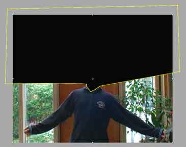 Beim Herausschneiden von Objekten aus einem Film entsteht ein schwarzes Loch. Dieses gilt es nun zu füllen. In meinem Fall sollte der Kopf verschwinden und an seine Stelle der ganz normale Hintergrund treten. Um dies zu erreichen filmt man die Szene einfach zweimal. Einmal mit und einmal ohne Schauspieler. Wichtig dabei ist, dass man die Kamera nicht bewegt. Nun legt man die beiden Videos übereinander (das mit dem Schauspieler oben auf) und schneidet in das obere ein Loch. Schon kann man den Hintergrund durchsehen. Man nennt solche Schnitte "Masken". Die einzelnen Punkte der Maske müssen nun für jedes Bild des Videos ausgerichtet werden, damit der Kopf stets richtig ausgeschnitten ist.