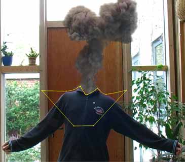 Damit es so aussieht, als wenn der Rauch aus der entstandenen Öffnung kommt, kam auch hier wieder eine Maske zum Einsatz. Alle Rauchpartikel, die vor dem Kragen liegen, wurden so abgeschnitten. Natürlich musste auch diese Maske in jedem Bild korrigiert werden, da sich der Körper ja bewegte. Diese Technik kann man zum Beispiel auch verwenden, um Rauch aus Fenstern kommen zu lassen oder wenn andere Objekte vor der Explosionsstelle sein sollen. Auch bei dem Rauch handelt es sich wieder um Stock-Footage, das von seinem Hintergrund befreit wurde. Auch hier bieten 3D-Programme die Möglichkeit, Rauchwolken ganz nach den eigenen Vorstellungen zu erstellen. Dies wird dann meist mit sogenannten "Partikel-Systemen" getan.